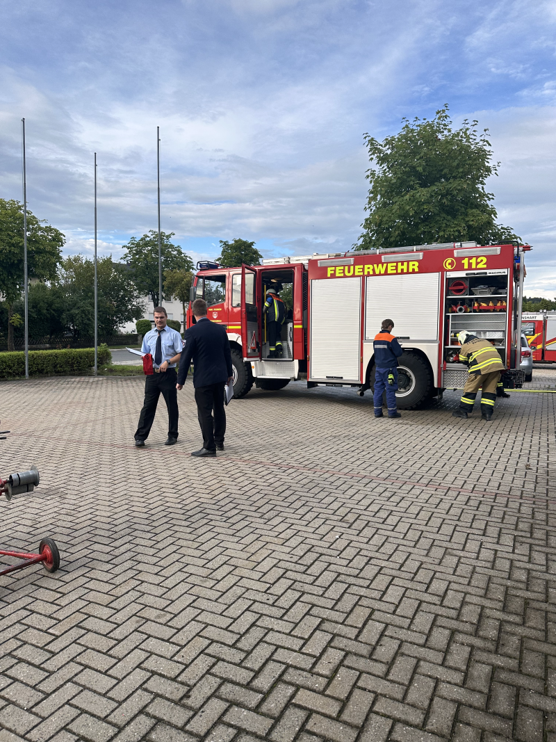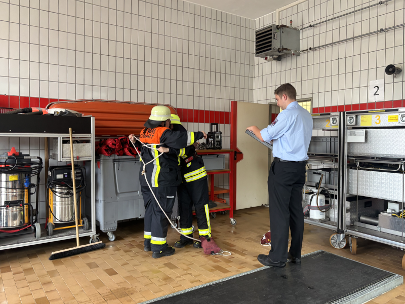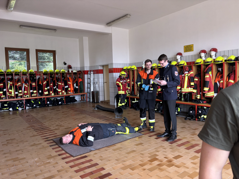 Die Abschlussprüfung begann mit dem praktischen Teil. Dabei mussten die Teilnehmer truppweise Einzelaufgaben absolvieren, wie das Auffinden einer bewusstlosen Person, die Vornahme eines Strahlrohrs oder das Sichern von Aktiven in absturzgefährdeten Bereichen. Der Prüfungstag wurde mit zwei Gruppenaufgaben abgeschlossen. Aus den Bereichen Brandbekämpfung oder Technische Hilfeleistung musste jeweils eine Aufgabe nach erfolgter Auslosung absolviert werden. Beim simulierten Brandeinsatz galt es, eine Wasserförderung vom Hydranten zum Löschfahrzeug und weiter zu einem angenommenen Brand aufzubauen sowie eine öffentliche Straße abzusichern. Bei der Technischen Hilfeleistung war bei einem Verkehrsunfall ohne eingeklemmte Person tätig zu werden. Bei beiden Übungsabläufen stellte die örtliche Feuerwehr den Gruppenführer, Maschinisten und Melder, und es wurde nur die Arbeit des jeweiligen Trupps bewertet. Anschließend folgte die schriftliche Prüfung, die zum ersten Mal digital durchgeführt wurde.