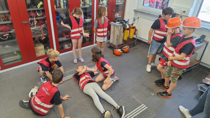 In der zweiten Stufe bewiesen die Kinder ihre Kenntnisse beim Bildmemory, dem Absetzen eines Notrufs und der stabilen Seitenlage. Auch das richtige Wenden einer Rettungsdecke wurde geübt. Zusätzlich mussten sie zehn schriftliche Fragen beantworten – eine echte Herausforderung, die mit Bravour gemeistert wurde.