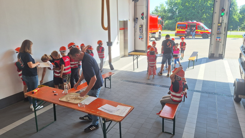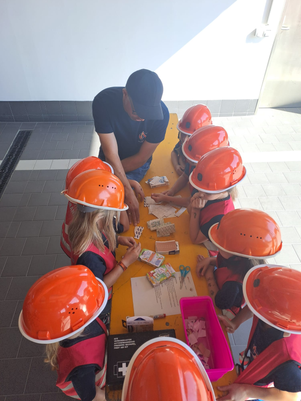 Die jüngsten Teilnehmer meisterten Aufgaben wie das sichere Erkennen und Aussortieren von Streichhölzern, das richtige Anlegen von Pflastern und das Zuordnen von Schutzkleidung. Mit viel Geschick transportierten sie Wasser mit einem Eimer über Hindernisse und beantworteten erste Fragen rund um die Feuerwehr.