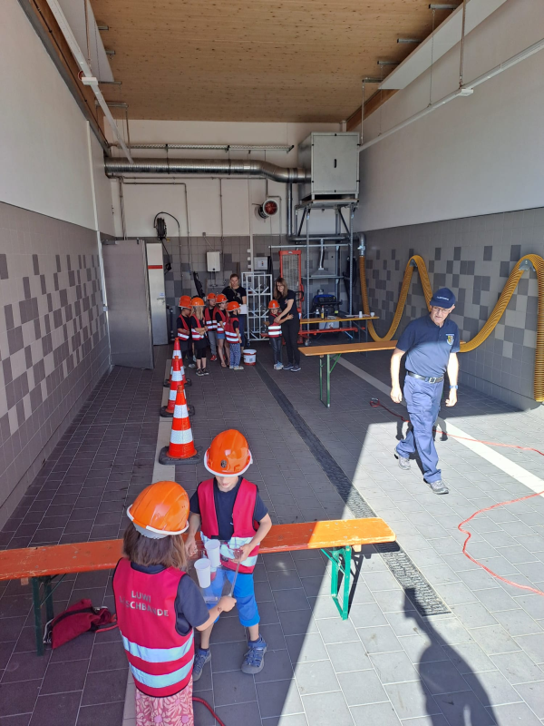 Die ältesten Teilnehmer zeigten, dass sie bereit für den nächsten Schritt sind: Mit einem Ball, der durch einen Schlauch bugsiert wurde, dem gezielten Einsatz eines Strahlrohrs und der Erklärung des Verbrennungsdreiecks demonstrierten sie ihr Können. Auch das Erkennen von Gefahrensituationen gehörte zum Programm. Wie in Stufe 2 rundete ein schriftlicher Test die Abnahme ab.