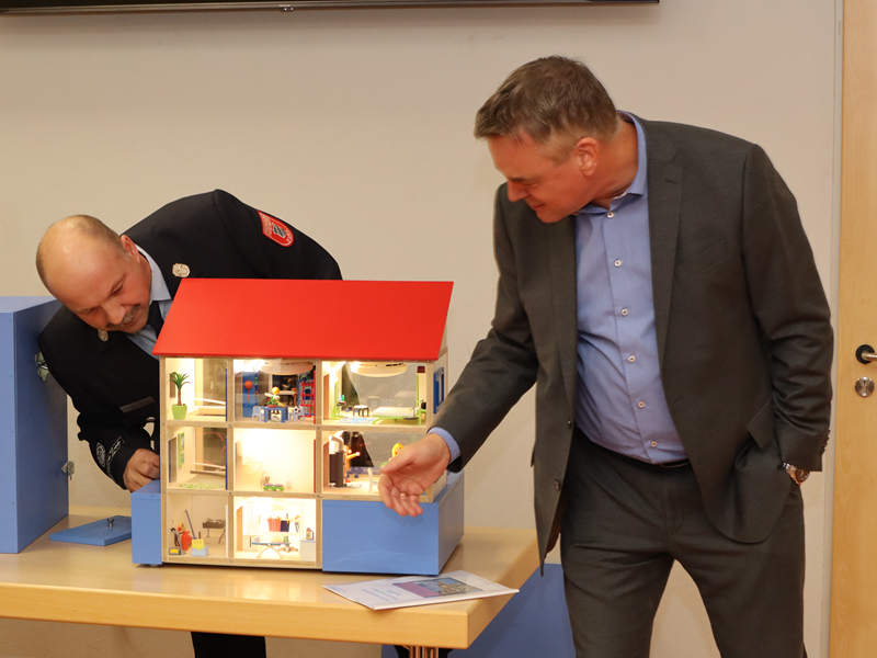 Grafenwöhr. Das neue Rauchhaus des Kreisfeuerwehrverbandes Neustadt an der Waldnaab ist zwar nur so groß wie ein Puppenhaus, kann aber Kindern und Erwachsenen lebenswichtiges Wissen vermitteln. Die Versicherungskammer Bayern spendierte das Modell im Wert von über 2.500 Euro. Kreisbrandrat Marco Saller nahm es von Florian Ramsl, Referent für die Feuerwehr-Förderung der Versicherungskammer Bayern entgegen.