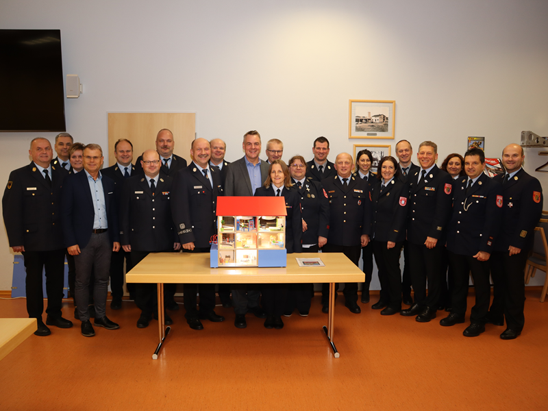 Der Verbandsausschuss des KFV Neustadt mit Florian Ramsl (Versicherungskammer Bayern, Bildmitte, grauer Anzug) bei der Übergabe des Rauchhauses