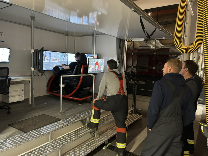 Trainerin Sandra Reichert von der Staatlichen Feuerwehrschule Regensburg erklärt: „Die Gruppe beurteilt nach jeder Fahrt anhand der Aufzeichnung die Situationen selbst. Viele sind von sich überrascht, was sie während der Fahrt im Stress alles übersehen haben.“
