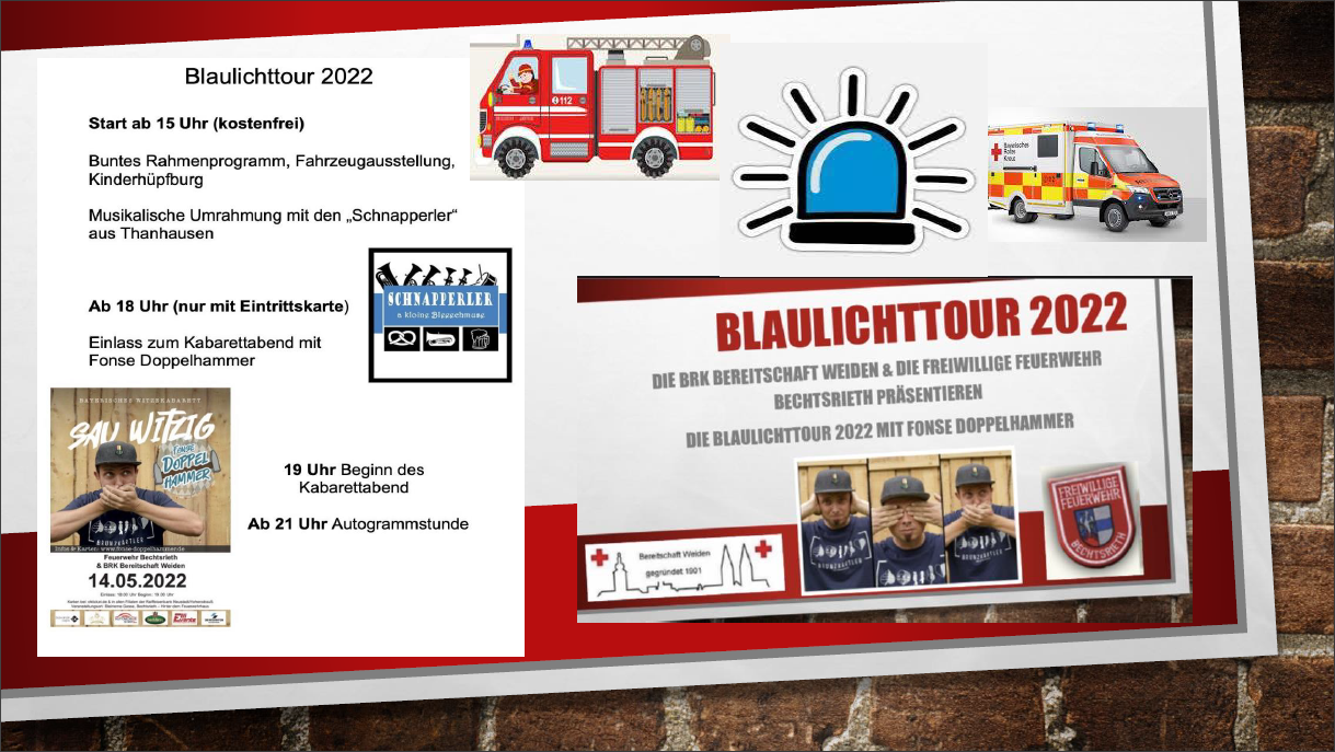 Die BRK-Bereitschaft Weiden und die Freiwillige Feuerwehr Bechtsrieth präsentieren die Blaulichttour 2022 mit Fonse Doppelhammer und laden dazu am 14. Mai 2022 herzlichst ein.