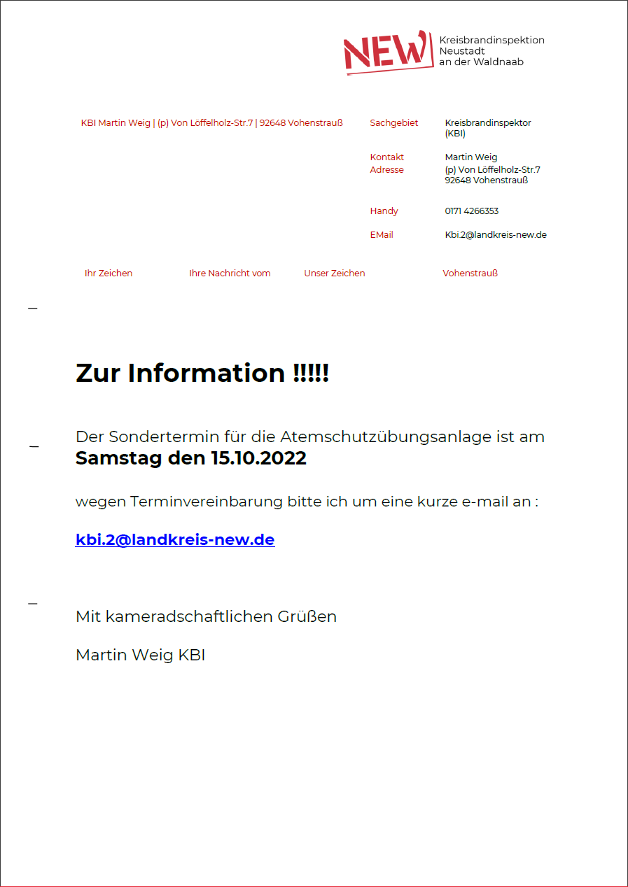 Eine Information von Kreisbrandinspektor Weig zum Sondertermin in der Atemschutzübungsanlage Neuhaus mit der Bitte um Beachtung: