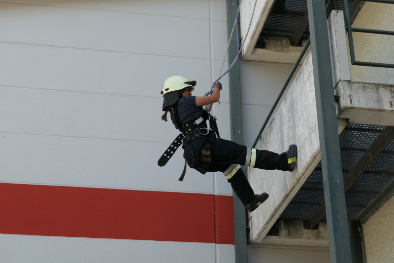 Im Praxisteil wurde die Knotenkunde ebenso wie der Umgang mit dem Material vertieft. Dazu wurde am Schlauchturm des Gerätehauses eine Übungseinheit Selbstretten, sowie das Vorgehen im vertikalen Vorstieg durchgeführt und an einer dafür geeigneten Brücke in Unterlind das Vorgehen im horizontalen Vorstieg mit dem Gerätesatz Absturzsicherung umgesetzt.