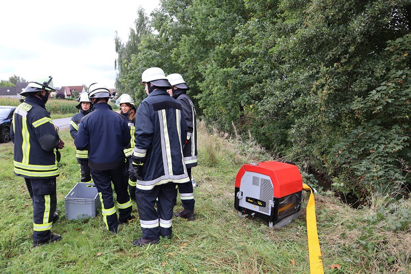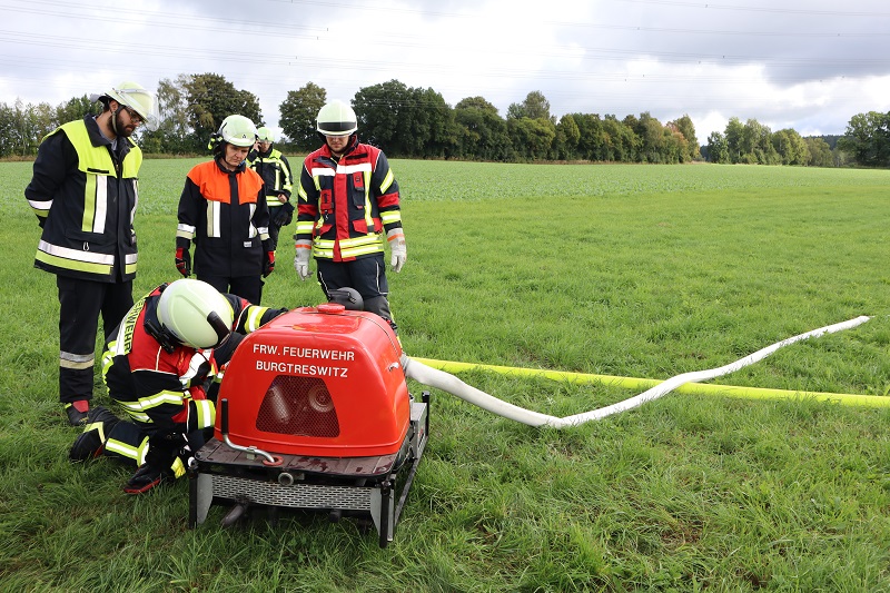 An drei Stationen wurden der Tankbetrieb am Tanklöschfahrzeug, der Ansaugvorgang mit dem Löschgruppenfahrzeug Katastrophenschutz (LF KatS) sowie der Hydrantenbetrieb mit einer Tragkraftspritze (TS) geübt. Vorhergehend wurden die Grundtätigkeiten eines Maschinisten in der Praxis geschult. Am Samstag folgte das Ansaugen am offenen Gewässer mit drei Tragkraftspritzen sowie die Wasserförderung über eine lange Schlauchstrecke. An diesem Tag unterstützten dankenswerter Weise zwei Kollegen aus Waldthurn bei der Ausbildung, indem sie mit dem Schlauchwagen Katastrophenschutz (SW KatS) die lange Schlauchstrecke verlegten. Für die Unterstützung der beiden Nachbarwehren bedankte sich der Lehrgangsleiter ganz besonders. In beiden Fällen hatten jeweils zwei Kameraden ihre Freizeit für den Lehrgang geopfert. Nach dem Wiederherstellen der Einsatzbereitschaft folgte noch ein Unterricht zum Thema Stromerzeuger, bevor es dann an die schriftliche Prüfung ging.