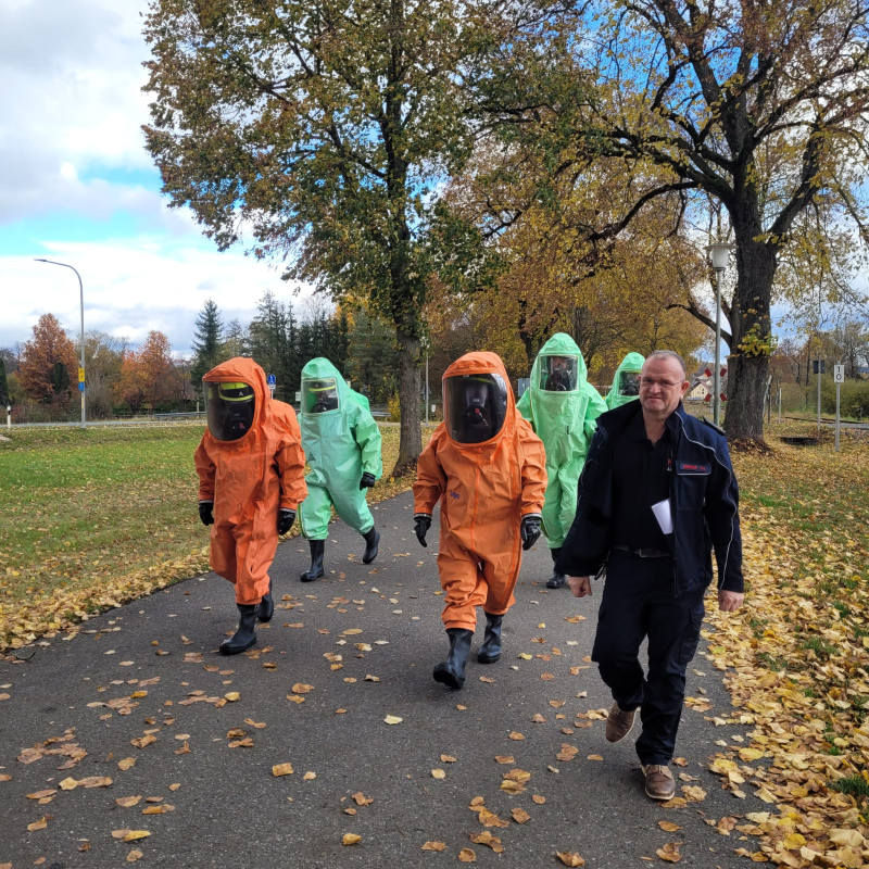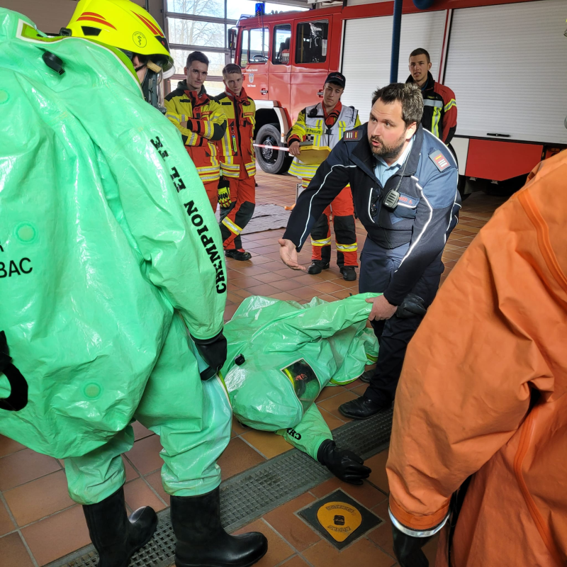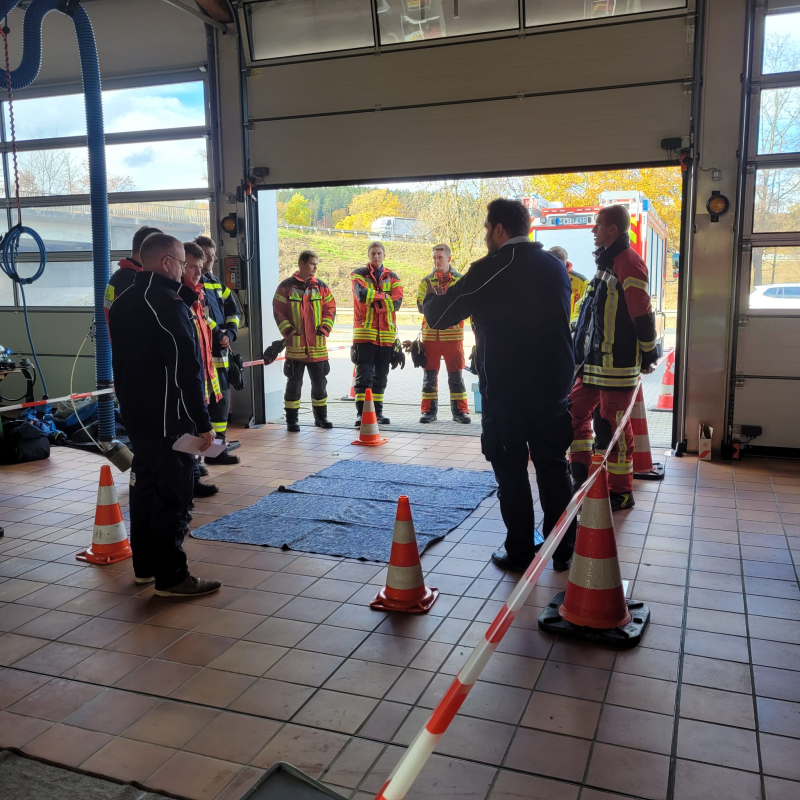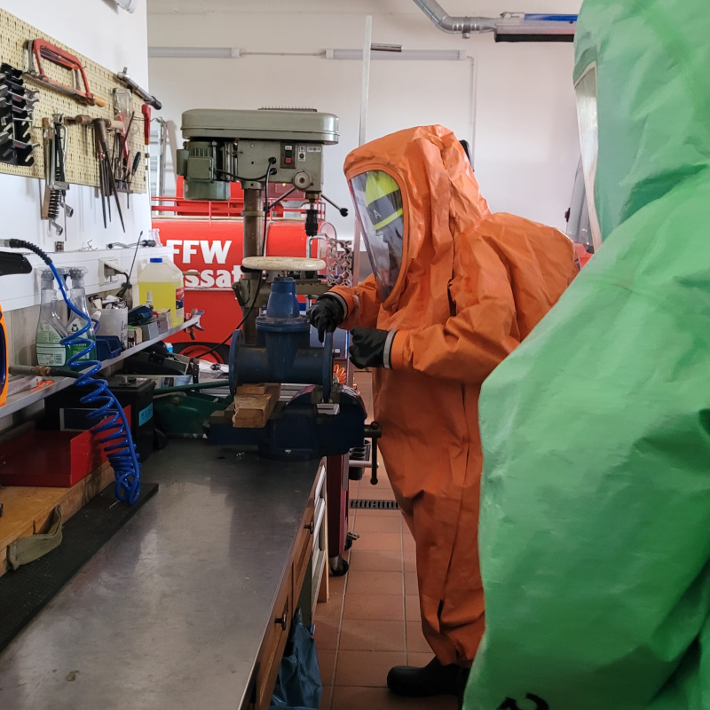 Schulungsinhalte waren unter anderem Aufbau und Schutzwirkung eines CSA, Handhabung, Notsituationen sowie eine Einsatzübung. Bei einer Einsatzübung wurde ein LKW-Unfall nachgestellt, bei dem chemische Stoffe austraten. Solche Situationen können entstehen, wenn bei einem Verkehrsunfall beispielsweise die Ladung beschädigt wird und Chemikalien entweichen. Aber auch in Laborräumen oder bei Fabriken kann so etwas passieren.