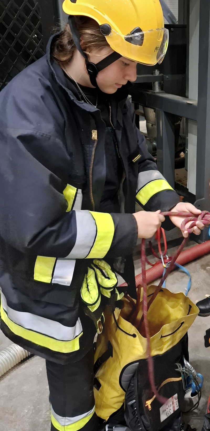 Das Ausbilderteam bestehend aus Marco Arnold, Christan Müller, Manuel Biewald und Dominik Muhr brachte den Teilnehmern im theoretischen und praktischen Teil das notwendige Wissen bei. Die Themenbereiche bei diesem Lehrgang sind dabei vielfältig und reichen von Einsatzgrundsätzen und -grenzen mit der klaren Trennung zwischen Absturzsicherung und Höhenrettung bis hin zur richtigen Beurteilung und Wahl von Anschlagpunkten. Hinzu kommen Gerätekunde, Wartung und Pflege sowie unter anderem das Verhalten bei Unfällen. Die verschiedenen Knoten vom Mastwurf, Halbmastwurf bis zum Achterknoten sind weiterer wesentlicher Bestandteil des Lerninhalts ebenso wie verschiedene Sicherungstechniken für den vertikalen und horizontalen Vorstieg.